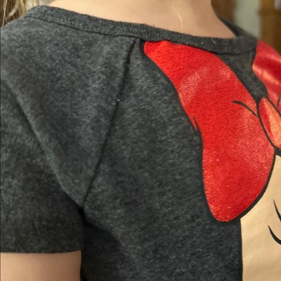 Screen print design featuring Minnie Mouse's iconic smile, ears, and bow with sparkling glitter; all-over print design on mesh skirt featuring cool, white polka dots