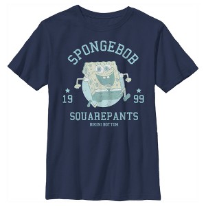 Are you ready kids? Head down to Bikini Bottom for the best Krabby Patty in the Pacific Ocean, grab a SpongeBob design and get ready for the best underwater adventure EVER with this Nickelodeon SpongeBob SquarePants Boys' Navy Tee! This awesome cool shirt features a distressed graphic of SpongeBob walking happily, along with his name and "Bikini Bottom" written across the front in blue letters, and the numbers "19" and "99" printed next to him.