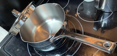 This sauce pan is really nice! I have the smaller 1.5 quart sized pan too, but this one is 3 quarts and has the same great features, only twice the size. The pan is made of stainless steel tha5 is smooth, sleek and has a good heft to it, but is not overly heavy either. The lid matching is made of both stainless steel and glass and has really nice features that I never knew I needed! There are strainers on both sides of the lid, one side has larger holes and the other has smaller ones, so depending on the consistency of the liquid, sauce, broth, etc., this pan and lid can handle it! And speaking of handles, the handle on this lid is wide and also has a venting hole. The pan itself also has etched measurements in both quarts and liters on the interior and serving spouts on either side of the pan. I have used this pan and the smaller one and both are so awesome to cook with, serve from, and the6 wash up well. These are also dishwasher safe, but hand washing is recommended. I’m really loving these pans and highly recommend them for their great quality and features.