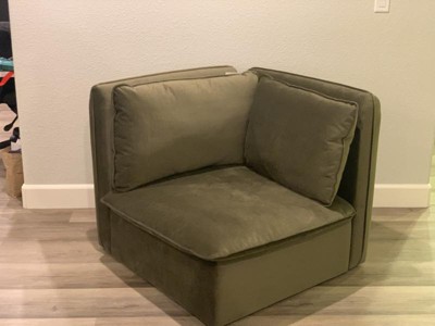I absolutely love this Haven Velvet Modular French Seam Corner Sofa in a beautiful dark green color. I was amazed how easy it was to assemble, the pieces literally fall into place with ZERO tools. I was able to build the couch by myself and lift each individual piece and put it into place. The material is super soft and feels amazing against my skin. Since this is a 'end' piece it fits in any corner of my living room or stand alone floating in the room because of its structure and how it is made. The cushion you sit on has a zipper so if it ever needs to be cleaned it is easy to remove the cover. The downside is the the two top pillows do tend to fall down as they just sit there on the sofa floating with no structure. It's a comfortable piece to sit on which is the most important part - I love that the sofa is big enough for my 6ft husband to sit on as well. Aside from that I love this chair and can't wait to build more on it. I highly recommend this.