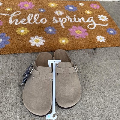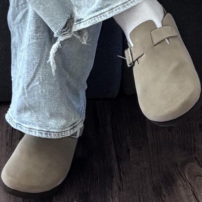 Upgrade your footwear collection with these Betsy Mule Flats from Universal Thread™. These stylish clog mules feature a neutral suede finish to pair with a wide range of casual or dressier outfits for go-to styling. Featuring a round-toe front and an instep strap with a metal buckle accent, they bring on-trend flair to your look. These flat clog mules with a medium shoe width offer comfortable wear, while a slip-on style makes them easy to put on and take off.