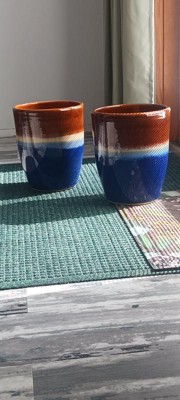 [This review was collected as part of a promotion.] THis two pack of planters are great. They are heavy ceramic and the colors are bright and true to the pictures. I have these outside and so far, they have held up to the sun, wind, and rain; they even survived a hail storm! They include a drainage hole, which is something I look for in all my planters (tendency to overwater and create root-rot...). The size is perfect for mid-size plants for indoor or outdoor.