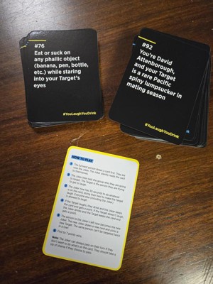 Fun game for adults! We love playing this game with other couples. The card game is all about laughter. If you get the Target to laugh you win. You will thoroughly enjoy playing this game with friends.