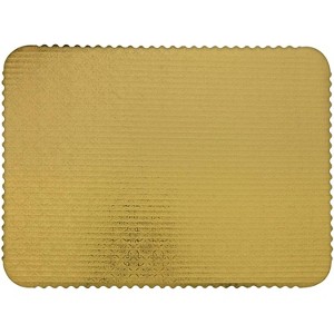 O'Creme Gold-Top Scalloped Rectangular Cake and Pastry Board 3/32 Inch Thick - Gold Rectangular Corrugated Full Size Cake Board 17" x 25" - Pack of 10. Enhance your cakes and pastries with this gold scalloped cake board. A scalloped cake board is usually used for cakes 2" or 3" smaller than the board