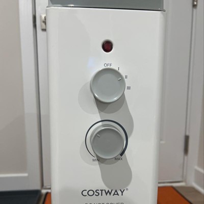 We like the narrow footprint and how simple it is to use. It also looks sleek. I'm not sure how much the water reservoir works because a few days after filling one halfway, the same amount of water was still there. Perhaps it's not dry enough where we are, but I was hoping it was more impactful than it seems to be. Also, we have a rug that has some uneven piling -- it's part of the design. One of the plastic pieces that holds one of the casters broke while gliding the heater over it. The design of the casters seems to be really flimsy (see image - we've tried to use heavy duty plastic glues to fix this but it hasn't worked) -- would be better if they were made of metal instead of plastic, particularly since the four wheels hold all the weight of the heater. Lastly, the side arms that pull out from the top do not pull out easily. They tend to stick and also seem like they'll break easily one day. I just got these about two months ago but already have had to ask for replacement parts (pending to see if they'll actually send any) or I may have to return it. Got the heater via Target, and thankfully they have a better return policy than costway directly.