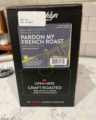 I purchased this Brooklyn Bean Roastery Pardon My French Roast Coffee Pods in a box of 40 pods. These pods brewed perfectly in my Keurig. This is a dark roast coffee. It has a smooth, smoky flavor. This coffee is strong and not for anyone that is looking for something sweet. I received an incentive to write this review.