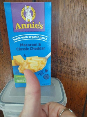 Bring creamy, cheesy goodness to your family table with Annie's Macaroni and Classic Cheddar. Made with elbow macaroni and real cheddar cheese, Annie's mac and cheese offers a great-tasting adult and kids dinner addition packed with irresistible flavor. Annie's mac and cheese with organic pasta contains cheese from cows not treated with rBST*, offering quality ingredients in every tasty bite. This pasta and cheese dinner side contains no artificial flavors or synthetic colors for a tasty serving of Annie's macaroni and cheese you can feel good about. Kids and adults will love the rich combination of real cheese and pasta, making it a perfect addition to lunch, dinner, or any time you're in the mood for something downright delicious. Annie's cheddar mac and cheese is ready in about eight minutes, helping you spend less time in the kitchen so you can enjoy quality time sharing a meal with your family. All you have to do is boil the pasta in water and drain in a colander. Follow package directions to add reduced fat milk, 2 tablespoons of salted butter, and the cheese packet. Then stir and enjoy. Serve Annie's macaroni and cheese as a side dish, use it to prepare baked bacon mac and cheese for your next family meal, or pair it with other kids food like chicken nuggets. This six-ounce box is easy to store in the pantry and contains about two-and-a-half servings for a quick kids mac and cheese dinner addition. Annie's makes products in over 20 family-friendly categories, from fruit-flavored snacks and cereal to mac and cheese. For busy bunnies and families on the go, we help make life a little easier and more delicious by spreading goodness through tasty foods and kindness to the planet. *No significant difference has been shown between milk derived from rBST-treated and non rBST-treated cows.