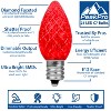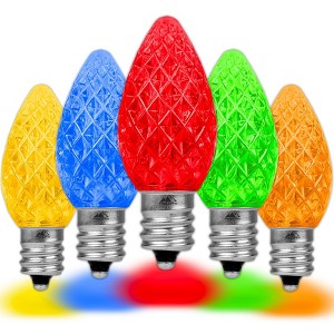 Diamond bright faceted C7 retrofit replacement lamps. Our brilliant C7 retrofit bulbs utilize a Super Bright 3 SMD LEDs creating evenly distributed vivid bright C7 LED bulb. We also use a thick plastic polycarbonate providing a durable LED C7 that will not chip, fade or crack. We also use a special diamond cut prism on the outside of all our retro-fit bulbs creating brilliant lighting effects. These SMD C7 bulbs are also dimmable making them perfect for animated displays. All of our LED C7 bulbs are energy efficient using only 0.80 watts and 0.0067 amps. Built to last with a 3 season warranty. Our C7 diamond faceted LED bulbs will provide years of quality use. Perfect for seasoned Christmas light installers and easy for anyone to decorate roof lines, trees, buildings, walkways and porches. Switch out those old incandescent C7 bulbs that consume too much energy for our energy efficient retro-fit C7 bulbs utilizing 3 super bright SMD LEDs. Our LED C7 diamond faceted bulbs can be used with ourC7 stringers(100 feet, 25 feet, 12.5 feet & 10 feet), as well as our commercial gradeC7 bulk spoolsand ourvintage twisted wire strings with E12 bakelite sockets.