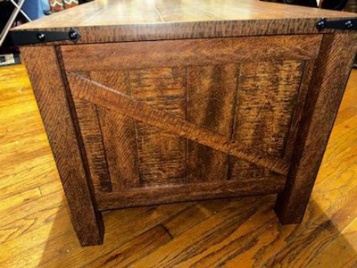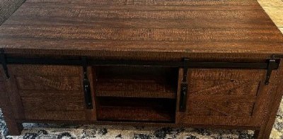 [This review was collected as part of a promotion.] I love the style of this coffee table. It fits with a lot of decor, be it old barn style, or classic. The sliding doors are probably my favorite feature, it's just a fun little thing. This table both holds and hides a whole slew of various living room junk. Candles, books, remotes, anything that will fit, really. I will say that you should make sure you have the space for it, though, as this thing is substantial. If you need more flat space than this, you need the dining room table!