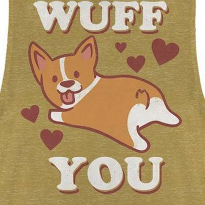 Get in the Valentine's Day mood with this officially licensed Juniors' Gold Heather Lost Gods Wuff You Festival Muscle Tank Top! Featuring a cute cartoon Corgi puppy with the words "Wuff You" and little hearts, you are sure to attract a cute Valentine this season! Dress in style with this new graphic tank top today!