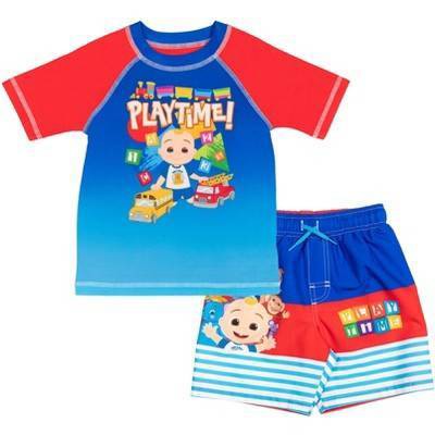 • Officially licensed CoComelon infant boys cool and stylish short sleeve swim shirt top and cute and stylish swimming shorts bottoms