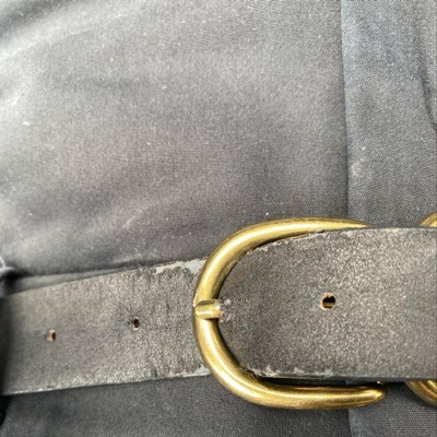 This Double Harness Metal Loop Belt from Universal Thread™ pulls any look together instantly. Featuring a smooth exterior with subtle textured detailing, this solid belt has a classy look that gets an extra style boost with the golden double metal loop, and its solid black color allows for easy pairing with both casual and dressy ensembles for versatile styling options. Plus, the double metal buckle closure with multiple hole adjustments make it easy to find a comfortable fit every time.
