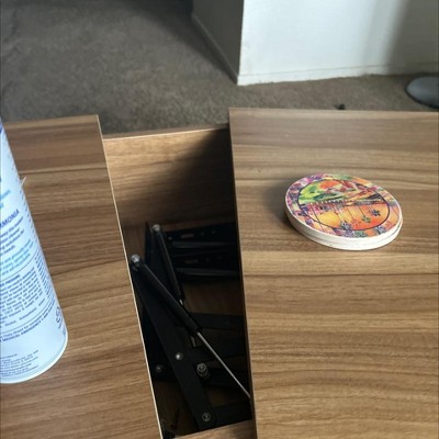 The lift top comes out on the left side of the coffee table, so you’ll have to sit on the left side of the couch. The lift tops are hard to open.