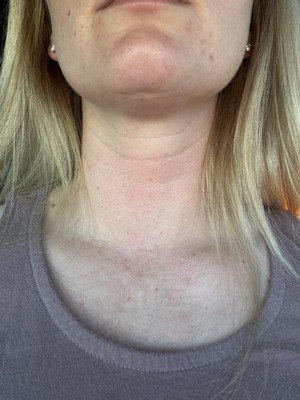After reading some of the precious reviews, I decided to do a patch test on my inner arm before using. That was fine, but when I used on my neck and chest, it caused the area to become red and itchy within an hour. Returned to store for a full refund