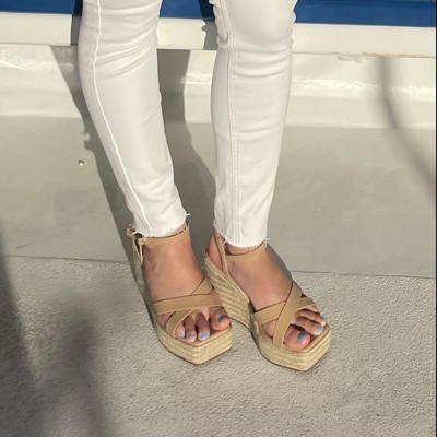 The Raniya wedge sandals from Journee collection will have you going anywhere you want without the fear of wearing the wrong shoes. Their supple vegan leather buckled ankle strap crisscross detail and open square toe will make these the perfect combination of features to give your look that beautiful finishing touch to make your outfit look better than ever. As a bonus their 4 mm � insole will leave your feet more comfortable than any other pair of sandals you own.