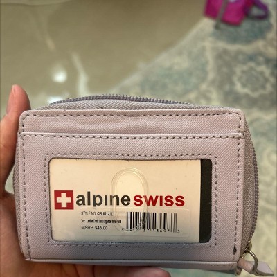 Mini Leather Organizer WalletBy Alpine SwissProduct Features:2 zippered pockets, Measures 4.5" x 3" x 1.5"Outside ID windowBack pocket opens and expands accordion style with 2 sectionsFront pocket expands same way has 6 separate sectionsFront pocket also has 5 Card slots between the sectionsFun ColorsAlpine Swiss QualityMade of Genuine LeatherMSRP $45.00