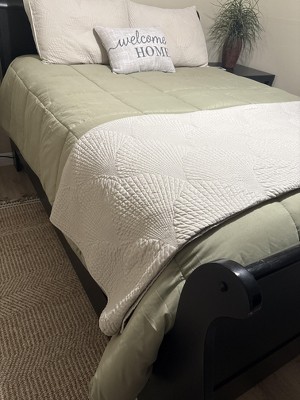 I really love the green color of the comforter, it matched perfectly with my decor! However, this comforter is not durable whatsoever, and mine is already falling apart at the seams in multiple spots after two washes.