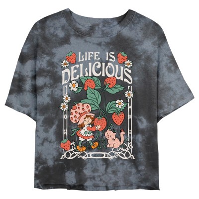 Who's ready for a berry special treat? You are! Enjoy sweet fashions with this officially licensed Strawberry Shortcake Berry Nice Day Greeting Juniors' Mineral Wash Graphic Crop Tee. Your favorite greeting card-turned-pop culture sensation is here to win your heart with fun adventures in Strawberry-land, alongside friends like Custard the cat and Pupcake the dog! This tie-dye crop tee shows off Strawberry Shortcake holding a strawberry and a watering can, encircled by the greeting "Have a Berry Nice Day" in distressed white text across the front.