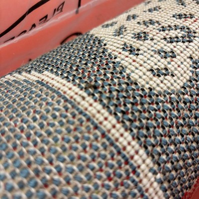 Soft rug, in the thicker side, and it was neat that the rug pile was contoured to give shape to the airplanes (kind of 3D). But the description says it has a latex backing but it does not. I need some grip to stay in place on my hard floor.