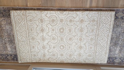 I love all of the Safavieh handmade tufted rugs I've purchased through Target. They are excellent quality, heavy rugs that stand up to time and I feel good about them being made of wool rather than synthetics. No shedding but you shouldn't use a vacuum with a roller bar - air suction only to maintain the beautiful loops. Although the description said there were light green hues, the picture of the rug wasn't green, so I took a chance in ordering it, thinking even it if it had a little green I'd be ok. The rug is actually predominently a pale green with touches of taupe and ivory. The pattern isn't seen at a distance. It just looks green. It would be nice for a bedroom.