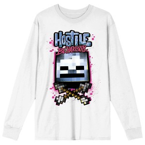 Craft your own style with this Minecraft tee. The shirt features an image of a skeleton head above a pair of crossed arrows while blue and red letters above the image read, "Hostile Behavior." The tee comes in a white long sleeve crew neck. Minecraft fans will love this comfy and cozy shirt.