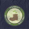 • Strut your stuff with this stylish new Earth Day men's t-shirt that is perfect for heading out into the wilderness! Featuring a distressed graphic of the Plant in the Boot encircled by the phrase "It's Never Too Late to Change" across the front.