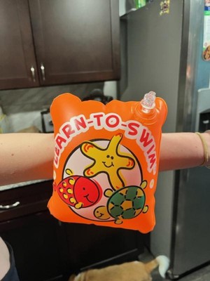 I remember using floaties like these when I was little. These orange "learn-to-swim" arm bands have a high quality, long lasting feel to them. Both of my children, ages 7 and 4, were able to use them. At first, I inflated the product completely, only then to find out that they were so tight, we could not get them on. It seems it would be best to slip them on the arm first, then inflate. The box offers little instructions, but says to inflate to full capacity. Ours were a little over half capacity. My 7 year old used them for quite a while. He is a reluctant swimmer, but with these on I could see his confidence rise and he tried wading in the water, and began jumping about and bobbing in the water. These arm floaties did not make him completely float on top of the water, which I see as a good thing. He still had to work to float and swim. I will encourage him to continue to use these as he learns.