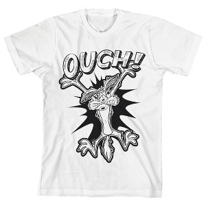 Hang out with your favorite cartoon characters with this Looney Tunes tee. The shirt features an image of Wile E. Coyote hitting a wall under shaded white letters that spell out, "Ouch." The tee comes in a white short sleeve crew neck. Looney Tunes fans will love this comfy cotton t-shirt.