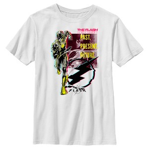 • Strut your stuff with this stylish new everyday boys' t-shirt that is perfect for every occasion! Featuring a glitched design of Flash running at you alongside the words "Past. Present. Future" in yellow letters, the iconic lightning bolt, and stills from the upcoming film!