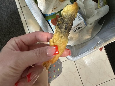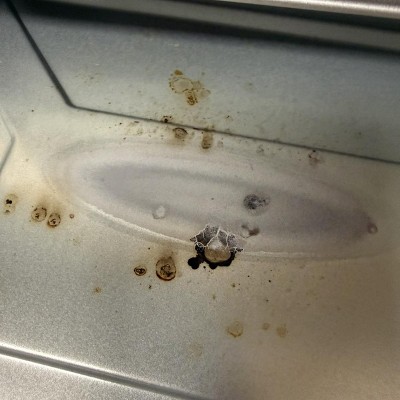 I purchased this online as a Christmas gift for my family. When we air-fried some shrimp tempura, it leaked black liquid onto the food, and I do not know what is wrong. I love the size, but I am very disappointed. I will be returning it.