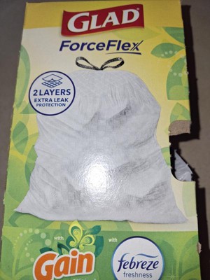 Branded well, “GLAD FORCE FLEX” I feel glad the bag flexes as I force more garbage into it!