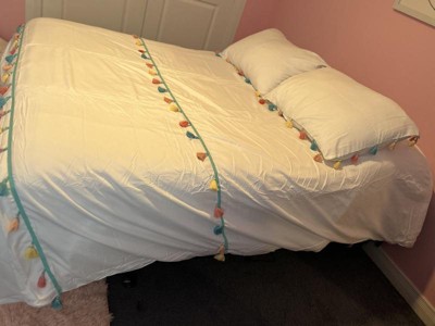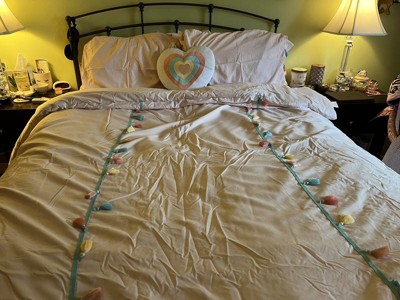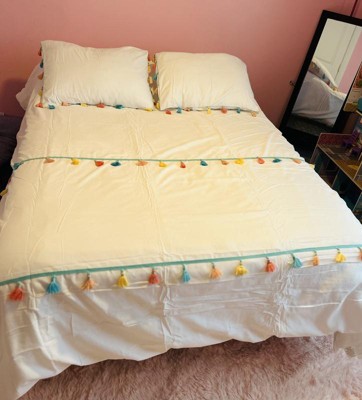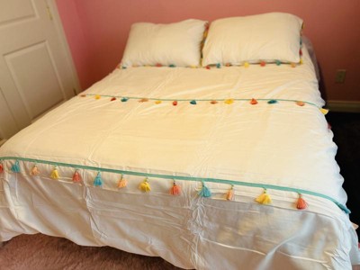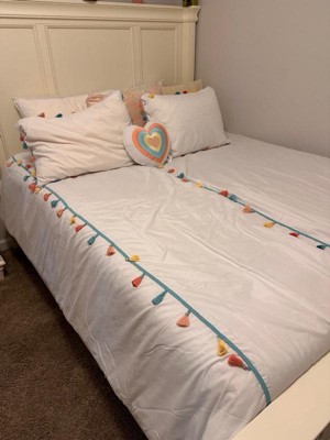 [This review was collected as part of a promotion.] I have been looking for new bedding for my little ones bed and this set was the perfect choice! With this set you get the comforter, two shams and a throw pillow. The comforter is white with various colored tassels. The matching pillow shams also have the cool tassels. The tassels really give the set a nice pop of color! The heart shaped throw pillow is super cute and completes the look. The material is super soft and high quality. I did wash and dry the comforter and the pillow shams prior to putting it on my little ones bed and it came out as good as new. The comforter fits her full bed perfectly. The pillow shams are also great as they have the overlap closure at the back which helps to keep the case secure. This set has definitely updated the look of my little ones bedroom! If you are looking for a new comforter set that is stylish and high quality, then I highly recommend this one!