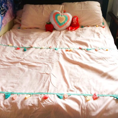 [This review was collected as part of a promotion.] I have the Tessa Tassel Comforter set with the heart shaped pillow, and it is perfect for my 4 year old daughter. She absolutely loves the vibrant colors and the adorable pillow. Quality of fabric is nice and soft. The tassels do not fray and have held up well.