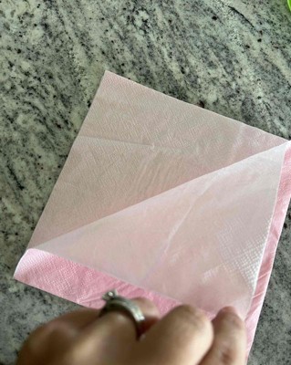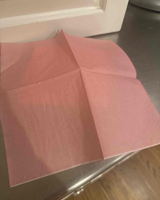 These are small beverage, napkins in a light pastel pink color that would match well with many party themes. The paper is soft and absorbent, and does not tear easily. There is also no lens that comes off of the paper. The paper is colored on one side and white on the other, it is a single ply beverage napkin. The size of the napkin is pretty small compared to the typical white paper napkin. I received an incentive to write this review.