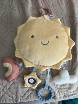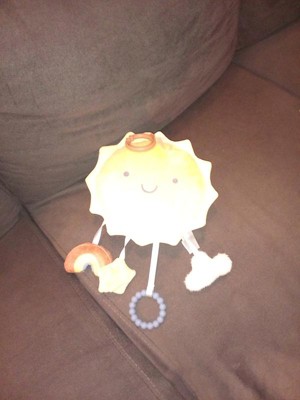 Wow..... This hang up or carry around toy is So Fun!! The kids are just having an absolute Blast with it. The Plush Sun Face is really cute and inviting to play with and then his little friends, the baby mirror sun, the rainbow and a cloud are along for all of the fun.