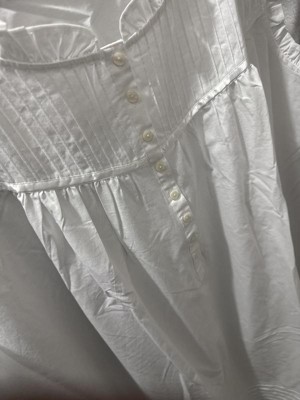 The neckline and armholes of these cotton night gowns for adult women are adorned with charming 3/4" ruffles, adding a delicate touch. The front yoke features tight pintucks, trimmed with satin ribbon, and the gathered front is complemented by a narrow placket with eight pearl shell buttons. The back boasts a double-layered yoke trimmed with satin ribbon, along with a gathered detail for added sophistication. The button up night gown for women flows into a slight A-line shape, with pintucks accenting the lower portion and a gathered hem finished with satin ribbon trim, creating a lovely and timeless look. Regular, petite and plus size vintage nightgown for all natural beauty lovers.