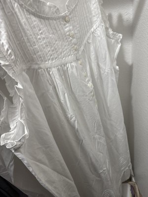 [This review was collected as part of a promotion.] Love the cool crisp look of this nightgown! It's made with high quality 100% cotton. The detailed lace and ruffles give it a nice feminine look. It has a nice flow to it, not too tight. That makes for a very comfortable gown to lounge about in. It washed well. Perfect for those warm nights.