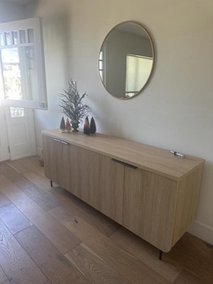 This sideboard is a beautiful and sturdy piece of furniture that fits well in various spaces like living rooms and dining areas. Guests appreciate its modern design, quality materials, and ample storage. However, many found the door alignment process challenging and time-consuming. Despite this, the overall satisfaction with the product's aesthetics and functionality is high.