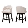 Bring happy hour to your home with the elegant Theron counter stool. Made in Malaysia, this mid-century inspired piece consists of a solid wood frame padded with foam and upholstered in soft fabric. Its curved backrest is adorned with an elegant button-tufted design and outlined with a graceful nail head trim that radiates classic refinement. The Theron requires assembly and is equipped with convenient footrests on each side for accommodating comfort. Complete with swivel capability, the Theron counter stool is a superb addition to any space. Overall: 21.70" W x 21.70" D x 37.20" H; Seating: 21.50" W x 17.70" D x 27.00" H; Arms: 31.00" H; Backrest: 11.25" H; Clearance: 18.50" H;