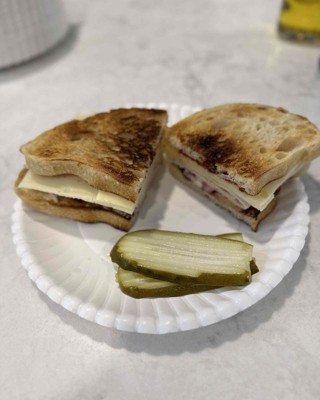We use a lot of paper plates in our house. I purchased these from Target. I would say anything heavier then a pancake would be to heavy for these plates. They are not very sturdy, strong or durable. Pretty thin paper plate. For the price you can get a more durable paper plate for every day use. I would probably use these for a piece of toast. I think a sandwich would be to heavy for this plate.