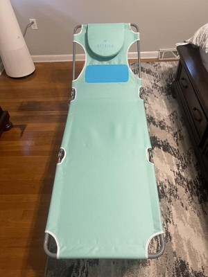 [This review was collected as part of a promotion.] I received this Deltess Corp. - Ostrich Chaise Lounge Folding Sunbathing Poolside Comfort Beach Chair, Teal from TryIt in exchange for my review, and I am SO thankful! It is an amazingly comfortable folding lounger in a gorgeous teal color. There is a carry strap to throw it on your shoulder, a face hole for laying on your stomach, arm holes for better comfort AND a panel that flexes to accommodate larger breasts. It's simply awesome! Get one, you won't regret it!