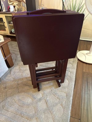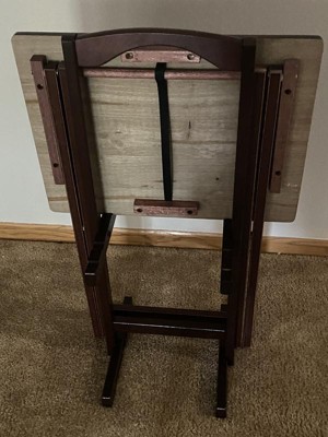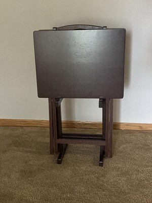 [This review was collected as part of a promotion.] The solid wood PJ Wood Folding TV Tray Tables with Compact Storage Rack, Espresso, 5 Piece Set are constructed very well, and have good stability and durability. The strap underneath ensures that the tables never expand incorrectly, and the stand for the tables is very sturdy and is easy to put together. The espresso color is what I was looking for and it matches my decor perfectly. I think the designers thought of everything when it comes to this simple yet effective table set.