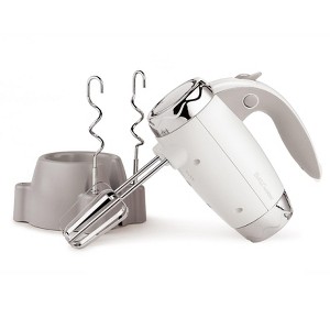 BETTY CROCKER Hand Mixer 7 Speed, 250 Watt Electric Mixer with Beaters and Dough Hooks, Ergonomic, with Stand and Soft Touch Handle, White