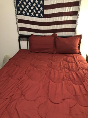 This is the perfect blanket for the Texas weather is lightweight yet cozy and comfy. it's true to size perfect queen size comes with two pillow shams. I love the fact that it is reversible has a black side and a red side depending on the mode we can change the whole decor of the bedroom by just turning it the other way the filling is also right I usually find some of them over stuffed or under stuffed. This is just right.