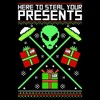 • Strut your stuff with this stylish new Christmas juniors' t-shirt that is perfect for the holidays! Featuring an ugly sweater design of an alien and two spaceships with the text: "Here to steal Your Presents," across the front.