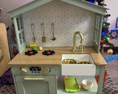 Disappointed with this purchase. The kitchen set arrived with what appeared to be refurbished or damaged parts from returned sets. The faux tiled wall was scratched and poorly painted (pinks do not match and the wall consists of 2 parts- top half dark pink and lower half light pink), and the screws for the utensil hooks were nearly impossible to install. I had to make cardboard washers just to keep the hooks upright (will glue them on). Spray painted poorly in general. Faucet knob and stove stop knobs turn. Overall size is also much smaller than expected, so I strongly recommend checking the measurements before purchasing. For the price, the quality and size are not acceptable. To add to the frustration, Target did not apply my $5 off $40+ online coupon to this order. Overall, this set is overpriced for what you get.