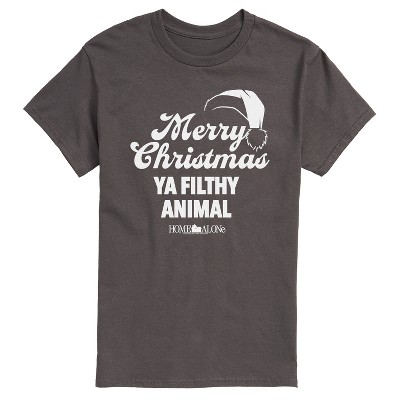 Kevin!! Watch out for the Wet Bandits because they're going to steal this officially licensed Home Alone Distressed Merry Christmas Ya Filthy Animal Men's Graphic Long-Sleeve T-shirt. Kevin McCallister's favorite gangster movie comes to life on this classic Christmas tee that features the text: "Merry Christmas Ya Filthy Animal," in a distressed style across the front. There's nothing more merry than outsmarting robbers this holiday season, so get in the spirit with this funny tee inspired by the beloved Christmas film, Home Alone.