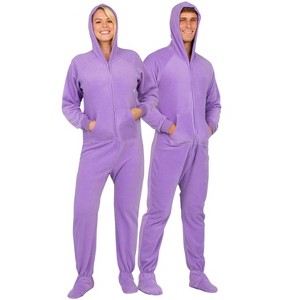 - FOOTIE PAJAMAS One Piece SLEEPWEAR: Roll out of bed, cozy up on the couch or head outside for some fun! Men, Women, boys and girls of all ages will absolutely love our hoodie pajamas with feet! Our pj's are made from a 100% polyester brushed polar fleece fabric, giving you a naturally flame resistant garment (NO CHEMICALS ADDED) with that warm and fuzzy feeling.