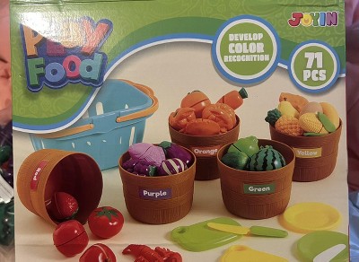 This a great food play set. Great sorting baskets. Love that the only stickers are the ones on the baskets for the colors. The banana has peels that you take off, the corn has three husks you take off and some nice touches like that. Over all a great food set. The grandchildren love playing with it.