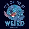 • The smallest family members are also the most stylish with this new toddlers' t-shirt that is perfect for every occasion! Featuring cute little Stitch rolling on the ground laughing framed by the words "It's Ok to Be Weird, Stitch Day 626" in blue font across the front.